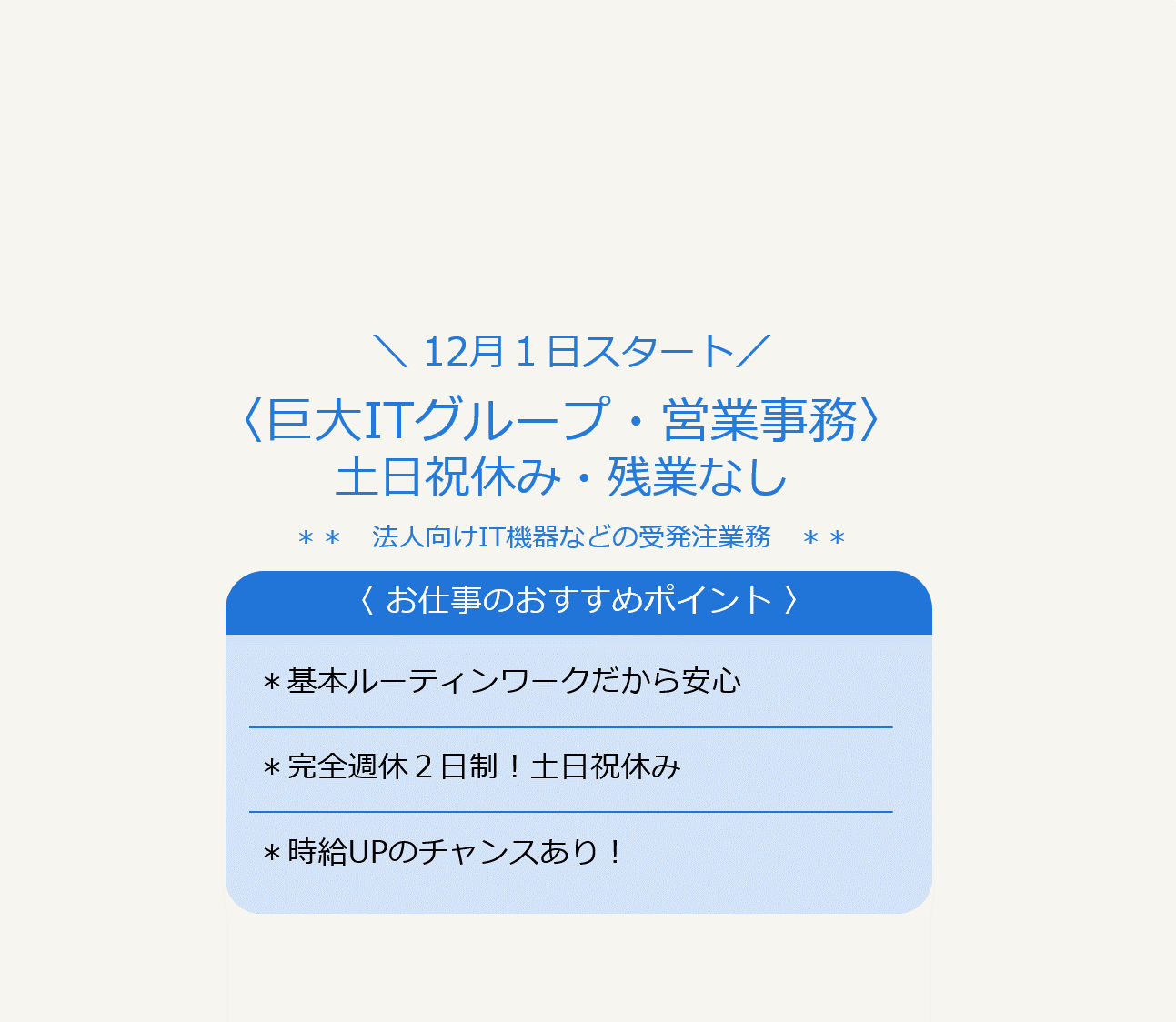 ランスタッド仙台泉事業所では宮城県内の事 務系やコールセンターのオペレーターなどオ フィスワークから製造オペレーターや軽作業 などのアクティブワークまで、幅広い職種の ニーズにお応えしております。 上記のオシゴトの他、ご希望に合わせてご提 案致しますのでお気軽にお問合せください! |